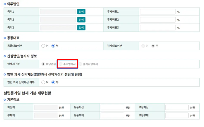 - 자본금, 사업연도, 회사구분(주식회사 등) 입력