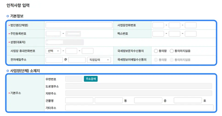 - 기본정보 입력 (대표자명, 사업장 소재지, 연락처)